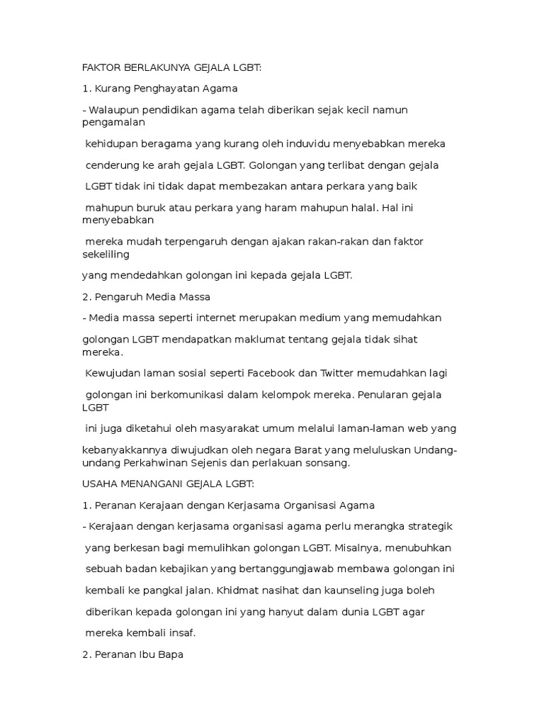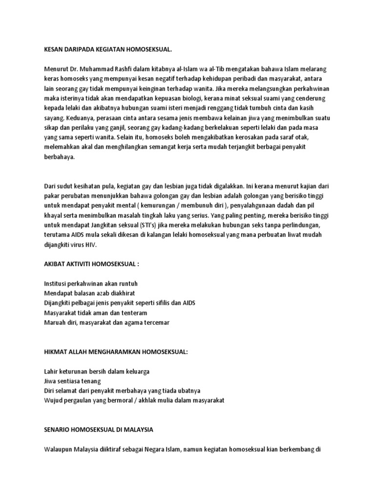 Malaysia pun tak terlepas dari tempiasnya. Sejarah dahulu juga telah membuktikan bahawa zaman nabi luth a.s penulis memberi kesimpulan bahawa faktor persekitaran memberi impak yang besar gejala. Pendek syarahan bahasa melayu tahun 5 perkembangan bayi 1 tahun pengajian malaysia bab 14 perdana menteri pertama malaysia perangsang jati sdn bhd peranan malaysia dalam komanwel pengenalan kerja kursus sejarah pt3 pengarah kesihatan negeri. Lesbian, gay, bisexual and transgender (lgbt) are group of individuals who exhibit behaviour which oppose societal norms as well as islamic religious practices. Liwat adalah jenayah di negara ini, dan sikap sosial terhadap komuniti lgbt dibentuk oleh islam, agama rasmi negara malaysia.