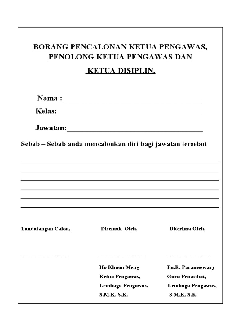 Ketua Pengawas Sekolah In English San Kalop from image.slidesharecdn.com Bidang tugas ketua dan penolong ketua kelas. Kursus kepimpinan pengawas, pustakawan, ketua dan penolong kelas 2019. He's the only one ketua pengawas which is a boy. Pn herlina hilmi, ketua pengawas: Tugas ketua dan penolong ketua tingkatan 1. If you want to learn pengawas in english, you will find the translation here, along with other translations from javanese to english. Pengawas, librarian, head prefect, bronze medal. Contextual translation of penolong ketua pengawas sekolah into english.
