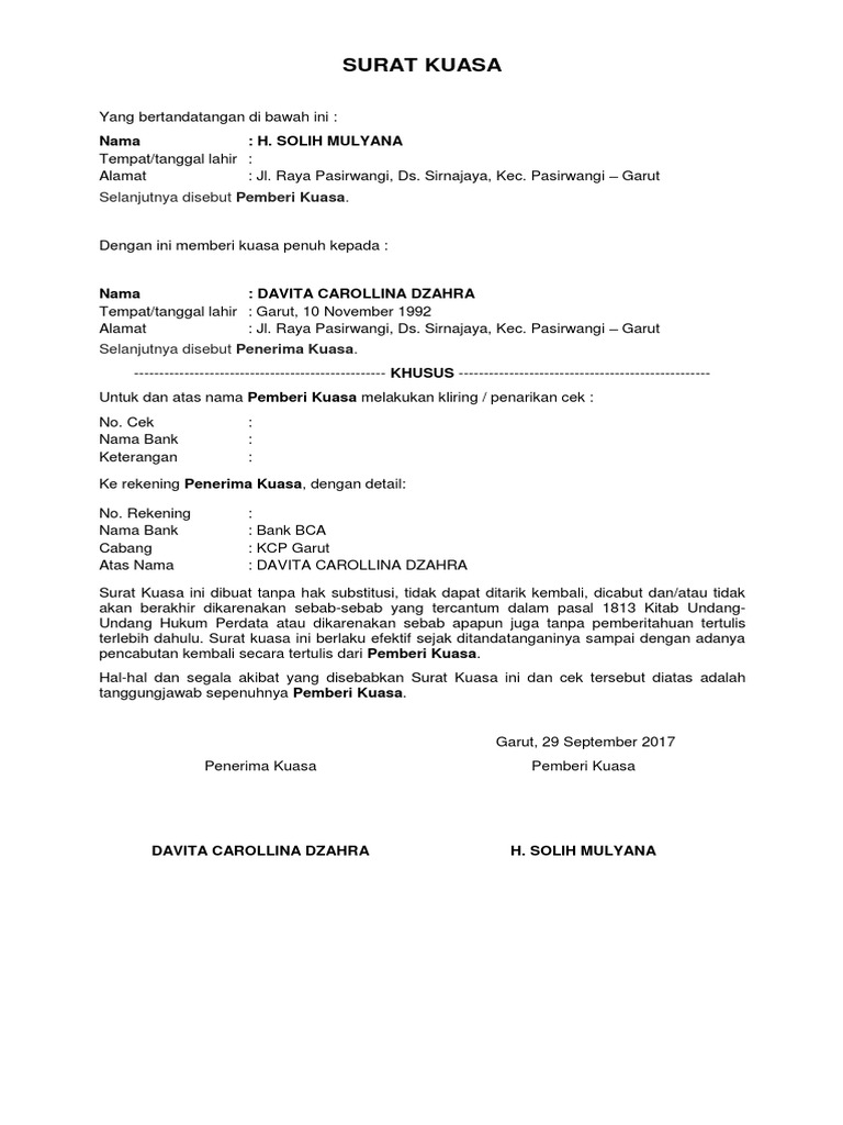 Misalnya surat kuasa untuk perwakilan pengambilan ijazah, pengambilan uang gaji. Beberapa contoh yang biasa dilakukan dalam pemberian surat kuasa ini adalah contoh surat kuasa bpkp, contoh surat kuasa pengambilan ijazah, contoh surat. Contoh surat kuasa pengacara untuk kepengurusan hukum contoh surat kuasa pengambilan uang di bank bni, mandiri, bca, bri Surat kuasa merupakan salah satu jenis surat yang berisi pemberian kuasa atau wewenang dari suatu pihak kepada pihak lain, sebagai perwakilan untuk melaksanakan sesuatu hal. Kepala surat atau yang biasa disebut kop surat resmi terdiri dari nama perusahaan atau organisasi, alamat, nomor kotak pos, kode pos, telepon, lambang atau.